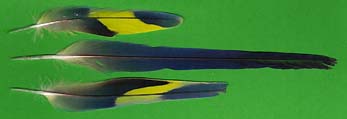 an luftgefüllten Kästchenzellen in den Federn. Zusammen mit gelben Pigmenten ergibt sich grün, mit roter Farbe violett. Je nach Verhalten bei Lichteinfall unterscheidet man weiter Schiller- und Seidenglanzfarben. Die prächtigen Spiegelfarben von Stock- und Krickente sind Beispiele dafür. Sie sind beim normalen Scannen (oben) kaum sichtbar und kommen nur beim Fotografieren unter bestimmten Winkeln zur Geltung (unten). |