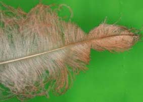 | Wieder eine andere Ursache haben Haftfarben. Beim Einfetten aus der Bürzeldrüse oder bei z.B. eisenoxidhaltigem Wasser werden die Federn oberflächlich gefärbt (z.B. der oft zu sehende rotbräunlicher Hals beim Höckerschwan oder die staubgefärbten weißen Federn eines Straußes rechts). |