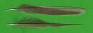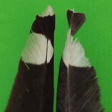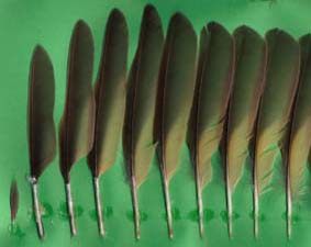 bis diese schließlich abfällt. Bei den links abgebildeten Singdrosselfedern sind bei H5 bis H9 zunehmend Mauserstadien zu erkennen, die inneren Handschwingen sind bereits erneuert. |