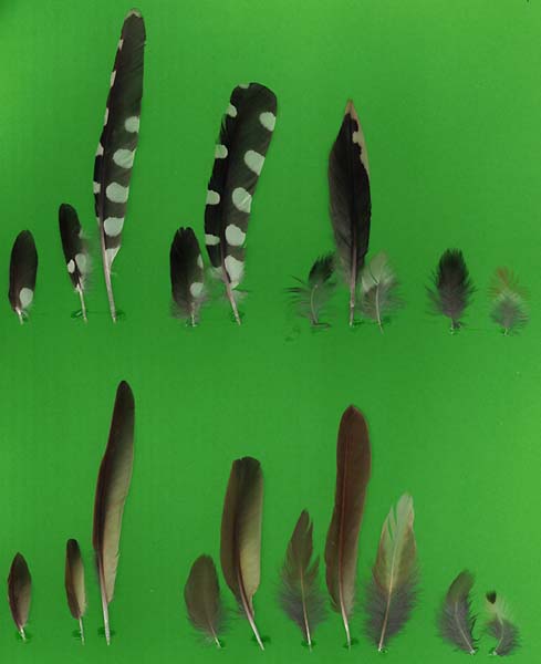 Beispielen sollen ein paar charakteristische Federtypen gezeigt werden (v.l.n.r.) (oben: Buntspecht, unten Singdrossel):