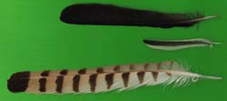 Erscheinungsformen der Vogelfeder. Viele Zeichnungsmuster sind bei bestimmten Vogelgruppen vorherrschend bzw. charakteristisch (beispielsweise die Rindenzeichnung bei Eulen und Nachtschwalben oder die gebänderten Schwingen und Steuerfedern bei Greifvögeln). Wie überall gibt es natürlich auch hier zahlreiche Ausnahmen – aber diese machen die Beschäftigung mit der Feder ja erst richtig interessant. Links werden einige Varianten der Zeichnungsvielfalt aus dem Gefieder eines Rebhuhns dargestellt. |