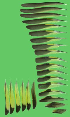 Die Federn des Männchens haben eine kräftig gelbe Zeichnung auf den inneren