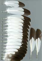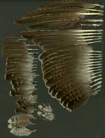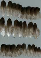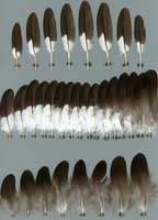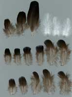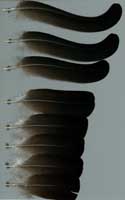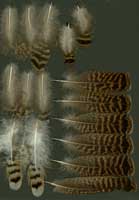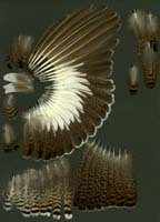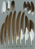 sehr groß, sowohl Färbung als auch Größe betreffend. Die H9 und H10 sind bei juv. Ex. spitz, bei ad. gerundet. Die äußeren S-Federn des M sind stark nach außen gekrümmt ("Spielhahnfedern"). Bei jungen M ist die Biegung noch nicht stark ausgebildet. Verwechslungsmöglichkeit besteht aufgrund der Maße mit dem ähnlichen Auerhuhn nicht. Die Zeichnung der Federn der Weibchen ist ähnlich. |