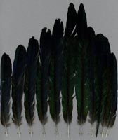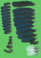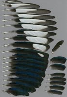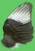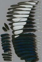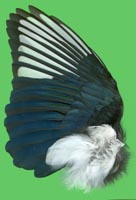ad. weiter nach außen. Kennzeichnend für juv. ist die H10, die länger und breiter mit weniger Weiß ist, als die von ad. Die A1 und ggf. auch die A2 haben bei juv. oft noch einen weißen Fleck auf der Innenfahne. Eine Geschlechtsbestimmung anhand des Gefieders ist nicht möglich. Verwechslungsmöglichkeiten bestehen wegen des intensiven metallischen Schimmers auf AS und S und der geringeren Größe nicht. |