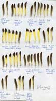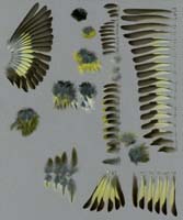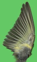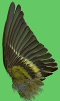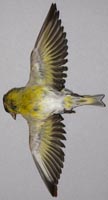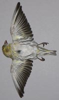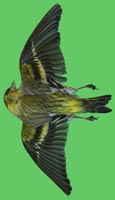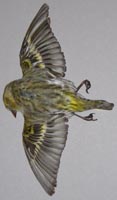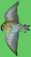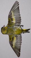 Säumen. Bei ad. sind diese schwarz mit mit grüngelben Säumen. Die S-Federn sind bei juv. mehr zugespitzt (Abnutzung beachten!). Eine Geschlechtsbestimmung ist bei juv. nicht und bei ad. nur anhand der Kopfplatte möglich. Ein Anhaltspunkt bietet auch die S-Zeichnung (Länge der Schwarzzeichnung), es bestehen aber große Überschneidungsbereiche. Einen Vergleich zum Grünfinken finden Sie hier. Verwechslungsmöglichkeit besteht allenfalls mit dem deutlich größeren Grünfink und entfernt mit Girlitz und Zitronengirlitz. |
