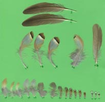 unterscheiden. Beim Felsenhuhn folgt auf die braune Spitze ein etwas breiteres schwarzes Band, gefolgt von einem rahmfarbenen Feld, das in ein hellgraues Feld übergeht, das vor dem Dunenfeld leicht orange gefärbt ist. |