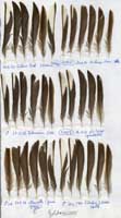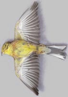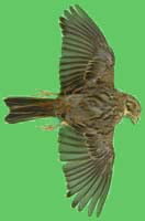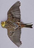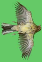 anhand des S möglich: Bei juv. sind diese deutlicher zugespitzt. Das Geschlecht kann bei juv. nicht und bei ad. nur tendenziell am Kleingefieder (Kopf, Brust) bestimmt werden. Bei M ist meist deutliches Rotbraun an Brust und Seiten zu sehen, die Scheitelfedern mehr als die Hälfte gelb. Bei W ist das Rotbraun kaum vorhanden und das Gelb am Scheitel erreicht max. die Hälfte der Federlänge mit dunklen Schaftflecken. Zur Variabilität der Steuerzeichnung siehe hier. Zum Vergleich verschiedener Ammern-Steuer siehe hier. Verwechslungsmöglichkeit besteht mit den anderen Ammern und mit Lerchen, Finken usw. mit weißen Schwanzkanten. |