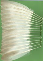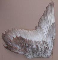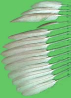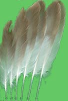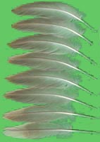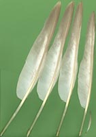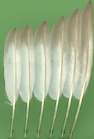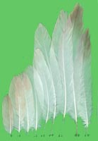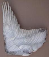 überflogen (juv.) mit Übergängen, die Federn können teilweise oberflächig Farbe aus dem Wasser annehmen (oft rotbraun). Kennzeichnend im Vergleich zu Sing- und Zwergschwan erfolgt die Verengung der If allmählich im flachen Winkel. A und S weisen bei juv. helle Endsäume auf. Das S ist stark gestuft (Unterschied ca. 10 cm) und damit spitz (ad.) und bei juv. an der Spitze eingekerbt. Es sind keine signifikanten Unterschiede am Gefieder der Geschlechter und zwischen den Jahreskleidern bekannt. Die Flügellänge des Männchens ist im Schnitt 40 mm größer als die des Weibchens. Verwechslungsmöglichkeiten bestehen mit den anderen Schwänen (Sing-, Zwerg-, Schwarz-), deren Federmaße aber teilweise signifikant anders sind. Infrage kommen weiter Silber-, Seiden-, Kuhreiher und Löffler, die aber meist kleiner sind. Die A und S des ad. Basstölpels sind kleiner (und am Geruch zu identifizieren). |