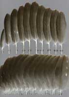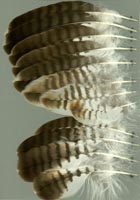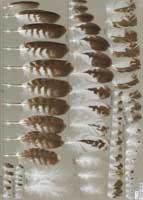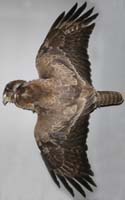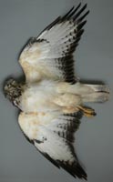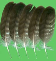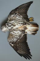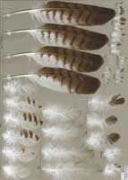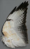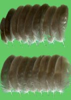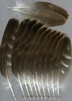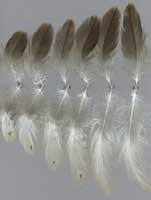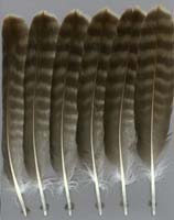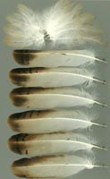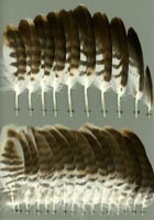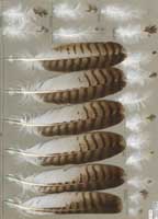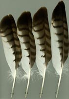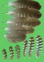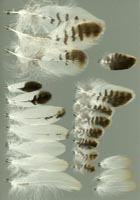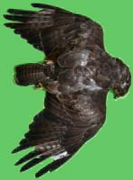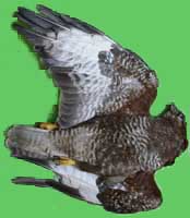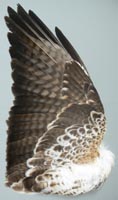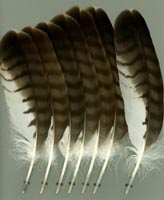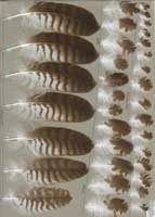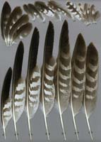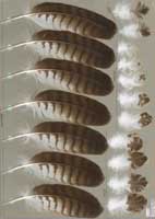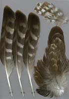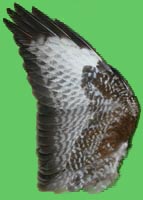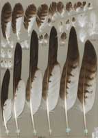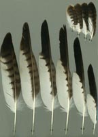 nicht zu unterscheiden, W sind etwas größer. Im Jugendkleid ist die Subterminalbinde des S kaum breiter als die darunter liegenden. Die Fahnenbreite der inneren H ist geringer als die der adulten Tiere. Verwechslungsmöglichkeiten bestehen vor allem mit dem Raufußbussard. Weiter kommt noch der Schwarzmilan infrage, dessen Federn aber insgesamt härter sind. Aber Achtung: Die Variabilität des Mäusebussardgefieders und besonders auch der des S ist sehr groß und verführt leicht zu Fehlbestimmungen. |