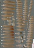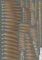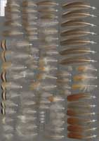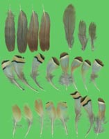 zugepitzten H9 und H10 zu erkennen. Verwechslungsmöglichkeit besteht besonders zu Chukar-, aber auch zu Rot- und Felsenhuhn die sich vor allem nur in den charakteristischen Flankenfedern unterscheiden. Beim Steinhuhn folgt auf die braune Spitze ein schmales schwarzes Band, gefolgt von einem rahmfarbenen Feld, das von einem zweiten schwarzen Band begrenzt wird. Es schließt sich ein hellgraues Feld bis zur Dunenbasis an. Die schwarzen Binden sind etwas schmaler als diejenigen vom Chukarhuhn. |