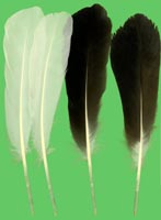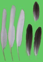 Gefangenschaftsflüchtlinge. Auch wenn der Schwan vollkommen schwarz scheint, sind die H und äußeren A bei ad. weiß, bei immat. mit einer dunkleren Spitze. Verwechslungsmöglichkeiten bestehen mit den anderen Schwänen (Sing-, Zwerg-, Höcker-), deren Federmaße aber teilweise signifikant anders sind. Infrage kommen weiter Silber-, Seiden-, Kuhreiher und Löffler, die aber meist kleiner sind. Die A und S des ad. Basstölpels sind kleiner (und am Geruch zu identifizieren). |